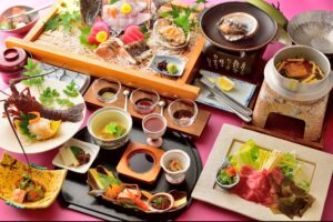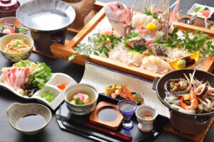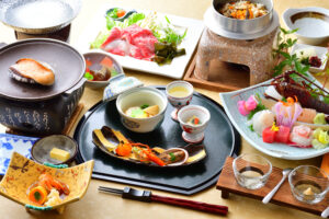 伊勢志摩国立公園南鳥羽に位置する相差町は漁師・海女の町。四季折々の海幸が豊富にそろいます。 春夏は、あわび・うに・岩牡蠣・ひじき・めかぶ、秋冬は、伊勢海老・なまこ・牡蠣・サザエなど様々。 当館の料理長のこだわりは、重兵衛の庭や近隣で育った地の食材を大切に一つ一つの食材を余すところなく生かすこと。 地元の漁師・海女から仕入れた、変わり種の地魚や当宿の庭で沢山採れた野菜など、余すことなく巧みに丁寧に調理し提供いたします。 海幸だけでなく三重ブランドの松阪牛などもお召し上がりいただけます。