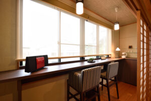 カウンターテーブルで夜の一杯を楽しめる新装・和モダンなど4タイプの客室がございます。