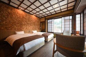 施設概要●客室全9室(母屋5室、離れ4室)●収容 25名様 ●チェックイン15:00/チェックアウト10:30 ●貸切風呂2つ(内湯、半露天風呂)●ラウンジ ●バリアフリー対応 車いす〇(館内に段差あり) ●駐車場(無料)、電気自動車充電器あり(1台要予約)